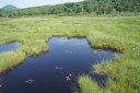 ワタスゲがそよ風に揺れ、遠くに黄色のエゾゼンテイカが神仙沼を鮮やかに彩る。湿地の養分が溶け出した褐色の池塘はミツガシワが若葉を広げる。
