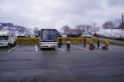 駐車場にて迎えのバスを待つ