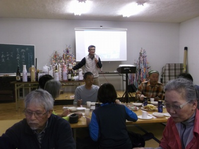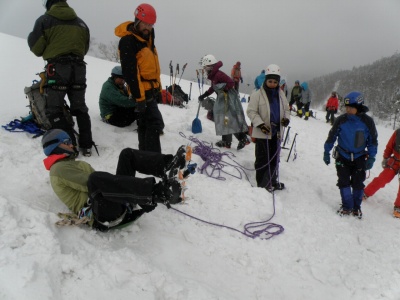 懇親会 太田顧問の乾杯で始まる 食担紹介 スタンディング・アックス・ビレィ SABの説明 明日の行動予定説明 2次会 4/19朝 救急法研修班 日勝ピーク スキー・スノーシュー班 氷雪技術 SAB班
