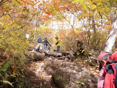 途中紅葉がきれいだった 元気3人組は8合目小屋まで立派な建物で地元岳連から管理人を派遣