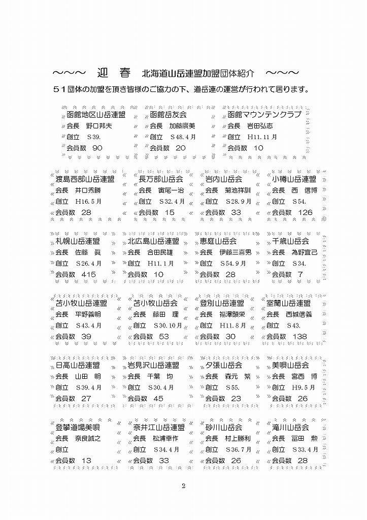 各会に発送した道岳連だよりに一部誤りが有りましたので訂正しお詫び申し上げます。 (下記の文書は訂正済みです) 2ページ 岩内山岳会 設立S28.9月 …(誤 S60) 3ページ 富良野山岳会 会長 秋葉久司様 …(誤 菊池祥訓様) 4ページ 登別嶝友会 会長 神原正紀様 …(誤 寅尾一治様)