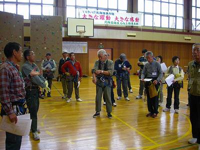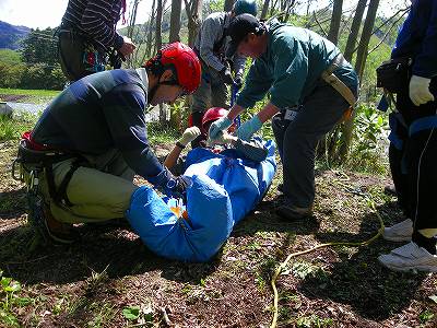 ロープワーク基礎研修 意見交換会 参加者全員自己紹介する 5/24 現場研修開始前に記念写真 笹を利用した支点 引き上げ研修 シート搬送 ロープに張力をかけナイフをいれ切断確認 張力800Kg、切れ目半分以上でようやく切れました