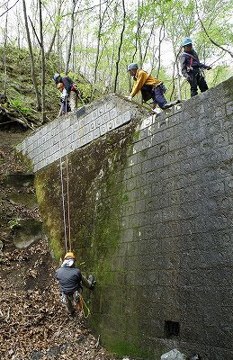 翌日は晴れ上がり8時30分より、研修所近くの沢の砂防ダムを利用し、垂直の7メートルの壁を肩がらみで一人ずつ人
